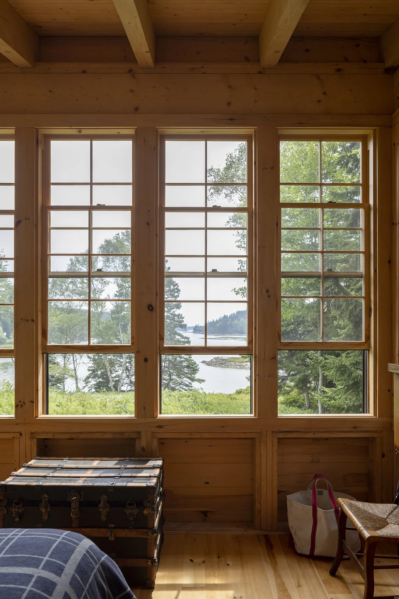 For a couple with adult children, the owners of this rare and wild cove property on an island in Maine envisioned a “camp” as suitable for large family gatherings as for solitary enjoyment. The sole existing structure, an 18th century cottage, underwent superficial renovations while three separate new wooden structures were designed for the site. Directed by a desire to minimize the impact of construction and habitation on so pristine a site, two smaller bunk houses are serviced by neither plumbing nor electricity, while a larger structure was designed with a kitchen, dining and living area. The bunk houses were configured to accommodate sleeping arrangements for multiple families or guests, while the larger structure, the “lodge” is a gathering place where guests come together for meals, relaxation, and entertainment. With a long view to the cove, a generous screened-in porch occupies the width of the main living space and is set off from it by sliding barn doors. Through the clerestory monitor atop the main volume, light bathes the space while permitting views to the sky. Upholstered window seats and a breakfast nook provide niches for relaxation and retreat. All new structures are uninsulated enabling the warmth of the unfinished wood studs and sheathing to create enclosure. Mono-pitch roofs, cedar shingles and carefully proportioned true divided-light windows create a unified vocabulary for all of the structures. With diverse vegetation and dramatic topography, thoughtful analysis went into the siting of the structures. Consideration was given to views, access and footpath connections, privacy, and orientation to sun and prevailing winds.